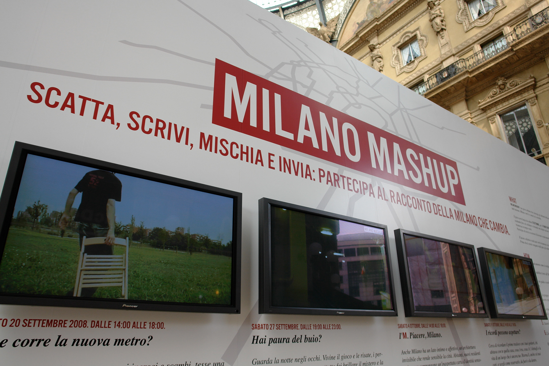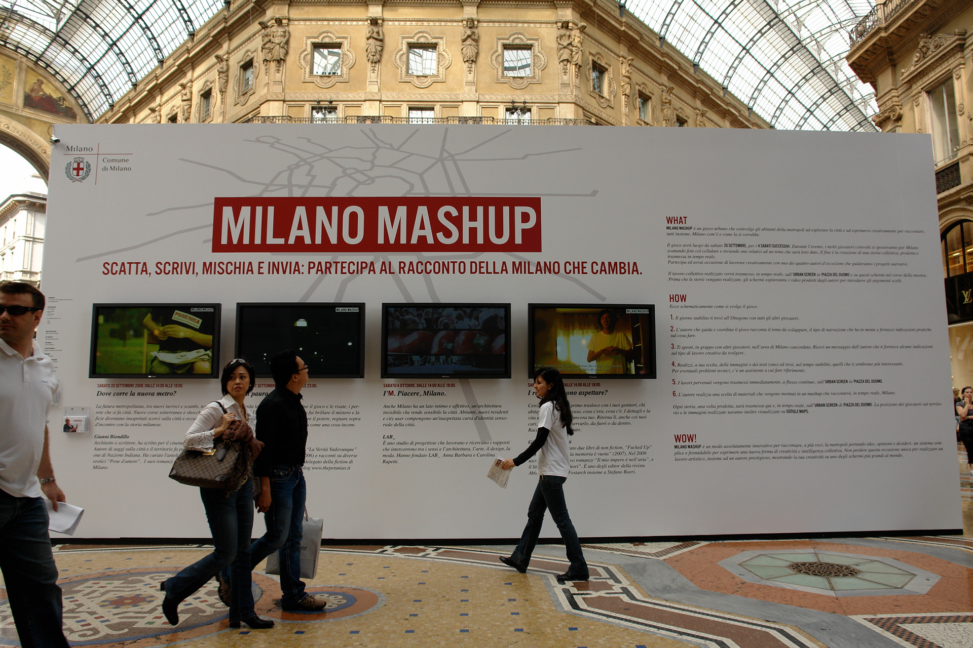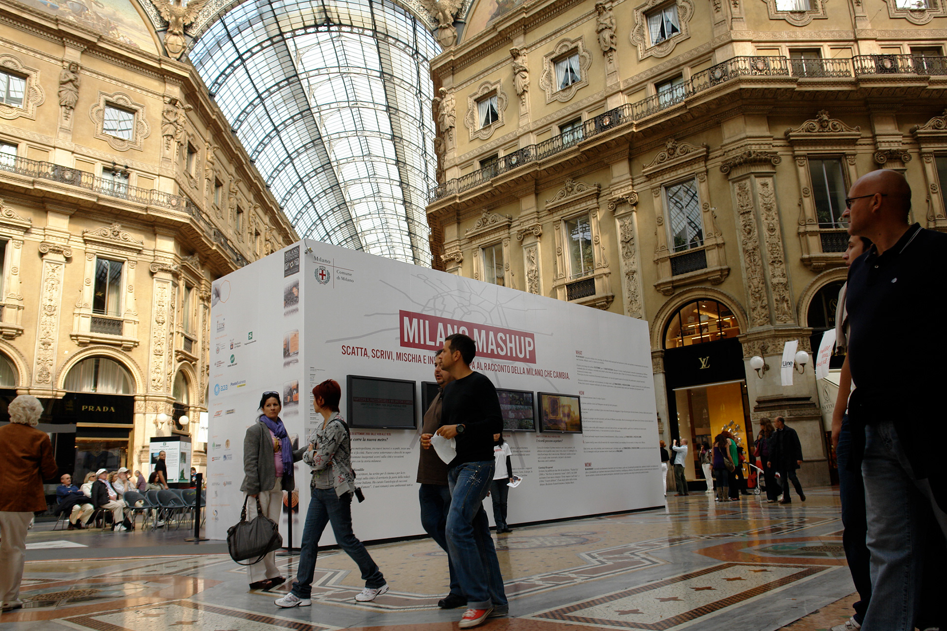 Sotto. L'allestimento di MILANO MASHUP presso la Galleria Vittorio Emanuele II, Milano.