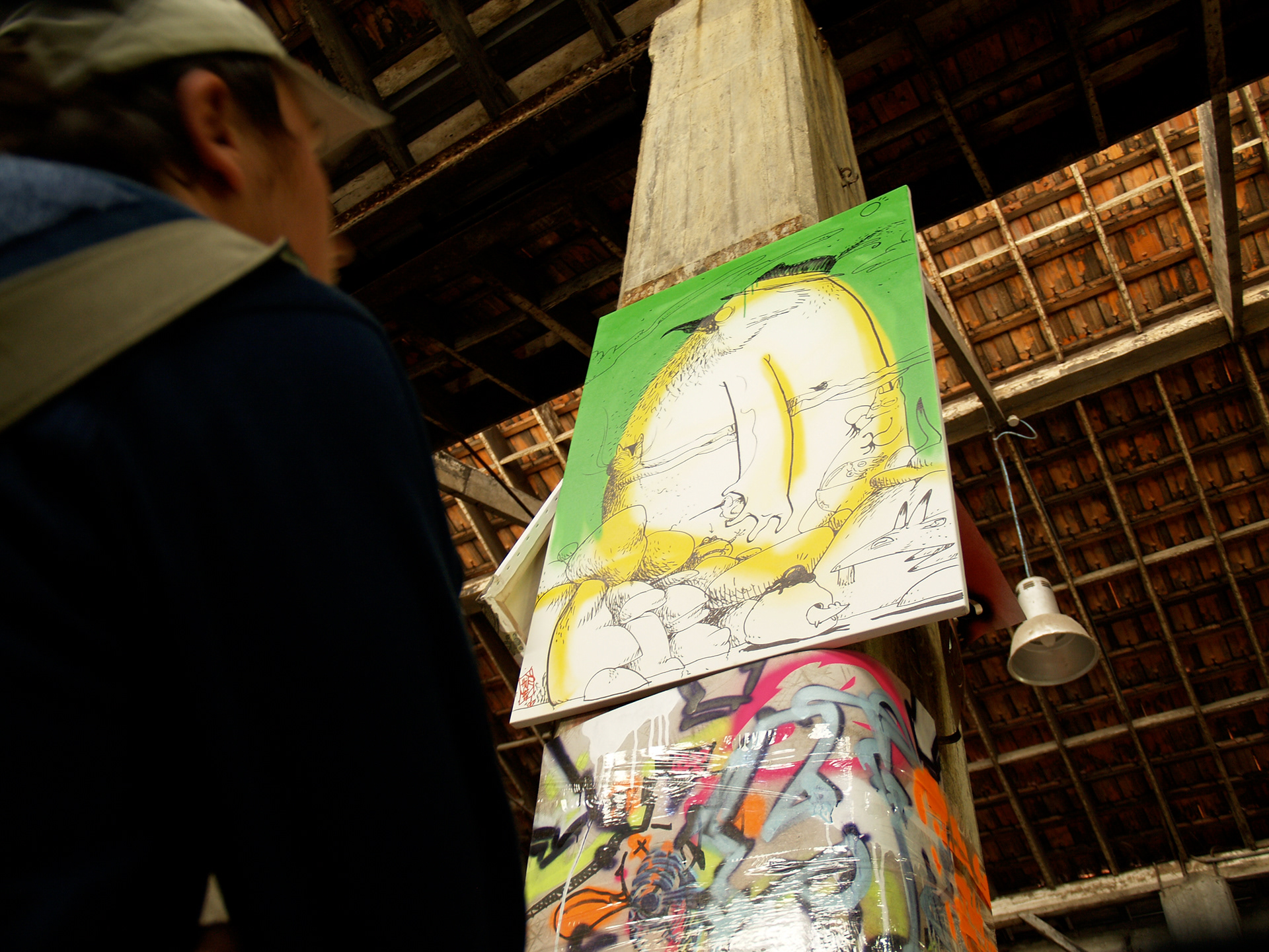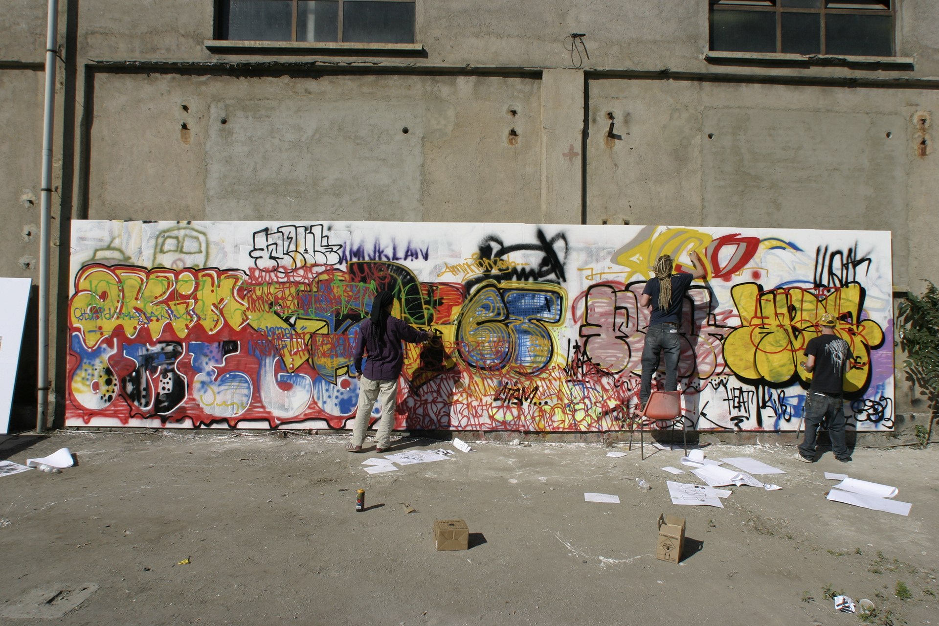 Azioni. I gruppi prendonno familiarità con i diversi strumenti, scoprendo le tecniche e i procedimenti per realizzare un dipinto. Gli artisti seguono i partecipanti dall’inizio del processo di pittura alla realizzazione di un “pezzo” finito. Segue una fase in cui viene lasciata piena libertà espressiva nel fare schizzi, nel disegnare e nel dipingere. Ad ogni partecipante vengono distribuite piccole tele di canapa su cui potersi esercitare anche al di fuori del workshop. In più, la tela dipinta dagli artisti nel corso del workshop, fornisce ai partecipanti l’occasione di osservare dal vivo e da vicino gli artisti al lavoro.